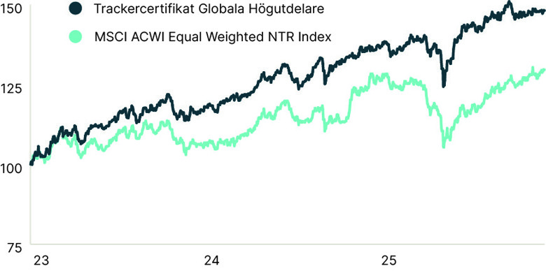 Sedan starten i november 2022 har trackercertifikatet överträffat jämförelseindexet MSCI ACWI Equal Weighted Index (som stigit med cirka 26%) med god marginal. Per den 3 november 2025 har trackercertifikatet ökat med över 45% och levererat en stabil utveckling trots ett volatilt marknadsklimat. Bolag med starka kassaflöden och tillförlitliga utdelningar har stått emot svängningarna bättre än genomsnittsbolaget på börsen, och Globala Högutdelare har därmed erbjudit en attraktiv kombination av stabilitet och långsiktig tillväxt.