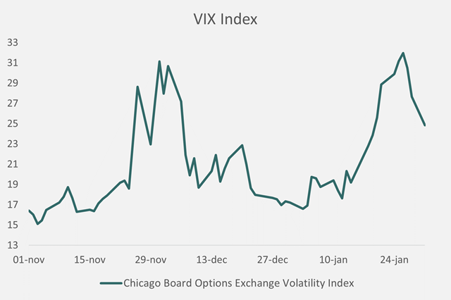 Det amerikanska storbolagsindexet S&P 500 föll i januari med 5,3 procent, vilket gör månaden till den sämsta sedan Coronakraschen i mars 2020. Ännu sämre gick det för räntekänsliga och tekniktunga Nasdaq Composite som backade hela 9 procent. Oron fick börsens volatilitetsindex (VIX) att klättra, som i slutet av månaden tillfälligt passerade 30-strecket.